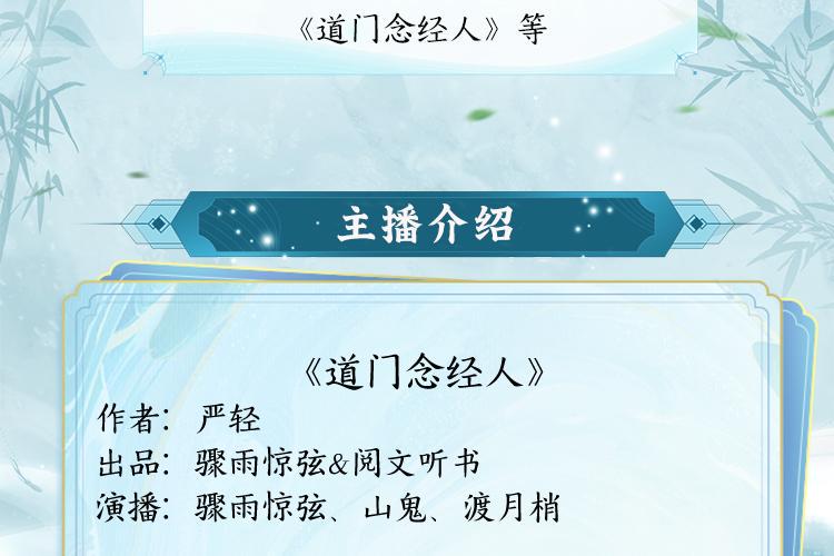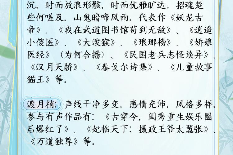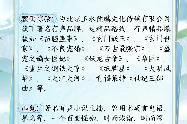 骤雨惊弦:为北京玉水麒麟文化传媒有限公司旗下著名有声品牌,走精品路线,有声精品爆款如《苗疆蛊事》、《玄门妖王》、《玄门世家》、《不良宠婚》、《万古最强宗》、《盛宠之嫡女医妃》、《妖龙古帝》、《枭臣》、《重生之钢铁大亨》、《纸牌屋》、《大明风华》、《大江大河》、肯福莱特《世纪三部曲》等。 山鬼:著名有声小说主播,曾用名莫言鬼语、墨名等。一个百变怪咖,时而诙谐,时而深沉,时而放浪形骸,时而优雅旷达。招魂楚些何嗟及,山鬼暗啼风雨。代表作《妖龙古帝》、《我在武道图书馆苟到无敌》、《逍遥小傻医》、《大泼猴》、《琅琊榜》、《娇娘医经》(为何合播)、《民国老兵志怪谈异》、《汉月天骄》、《泰戈尔诗集》、《儿童故事猫王》等。 渡月梢:声线干净多变,感情充沛,风格多样。参与有声作品有:《古穿今,闺秀重生娱乐圈后爆红了》、《妃临天下:摄政王爷太嚣张》、《万道独尊》等。