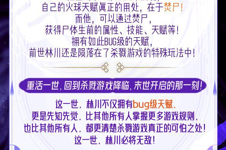 杀戮游戏降临,全球末世开启!所有人觉醒天赋,等级从F级到S级不等! 前世,林川觉醒没有品级的火球天赋,然而他的火球对活物根本无法造成伤害! 他直到末世第五天才发现,自己的火球天赋真正的用处,在于焚尸! 而他,可以通过焚尸,获得尸体生前的属性、技能、天赋等! 拥有如此bug级的天赋,前世林川还是陨落在了杀戮游戏的特殊玩法中! 重活一世,回到杀戮游戏降临,末世开启的那一刻! 这一世,林川不仅拥有bug级天赋,更是先知先觉,比其他所有人掌握更多游戏规则,也比其他所有人,都更清楚杀戮游戏真正的可怕之处! 这一世,林川必将无敌!