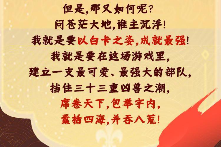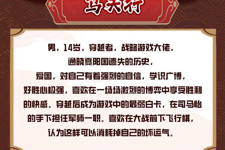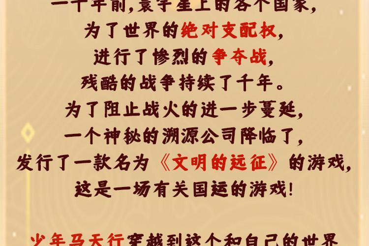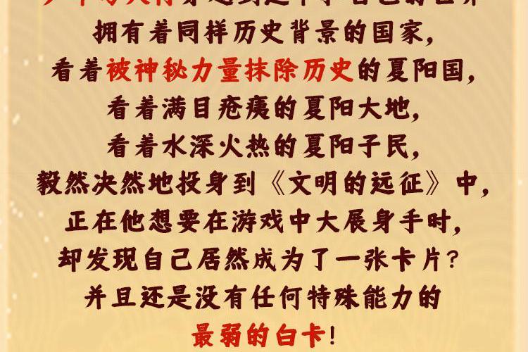 一千年前,寰宇星上的各个国家,为了世界的绝对支配权,进行了惨烈的争夺战,残酷的战争持续了千年。为了阻止战火的进一步蔓延,一个神秘的溯源公司降临了,发行了一款名为《文明的远征》的游戏,这是一场有关国运的游戏! 少年马天行穿越到这个和自己的世界拥有着同样历史背景的国家,看着被神秘力量抹除历史的夏阳国,看着满目疮痍的夏阳大地,看着水深火热的夏阳子民,毅然决然地投身到《文明的远征》中,正在他想要在游戏中大展身手时,却发现自己居然成为了一张卡片?并且还是没有任何特殊能力的最弱的白卡! 但是,那又如何呢? 问苍茫大地,谁主沉浮! 我就是要以白卡之姿,成就最强! 我就是要在这场游戏里,建立一支最可爱、最强大的部队,挡住三十三重凶兽之潮,席卷天下,包举宇内,囊括四海,并吞八荒!