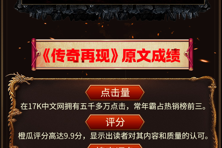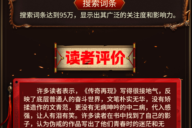 点击量:在17K中文网拥有五千多万点击,常年霸占热销榜前三。· 评分:橙瓜评分高达9.9分,显示出读者对其内容和质量的认可。· 搜索词条:搜索词条达到95万,显示出其广泛的关注度和影响力。读者评价:许多读者表示,《传奇再现》写得很接地气,反映了底层普通人的奋斗世界,文笔朴实无华,没有矫揉造作的文青范,更没有无病呻吟的中二病,代入感强,让人有泪有笑。许多读者在书中找到了自己的影子,认为伪戒的作品写出了他们青春时的迷茫和无助,也反映了社会的残酷现实。