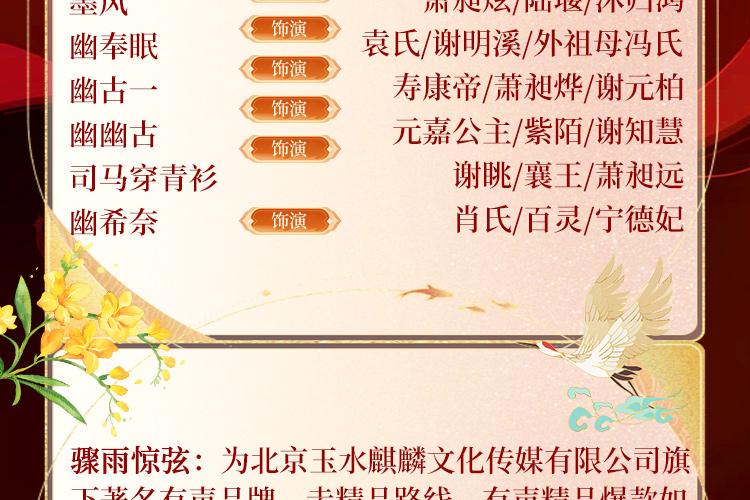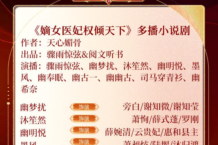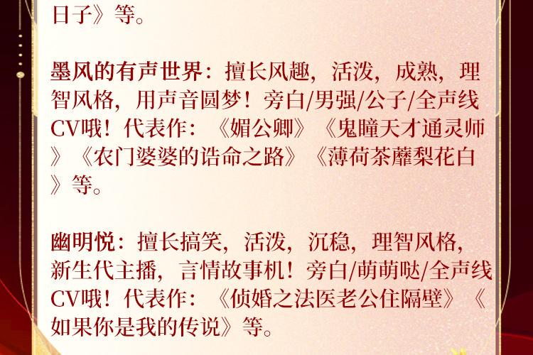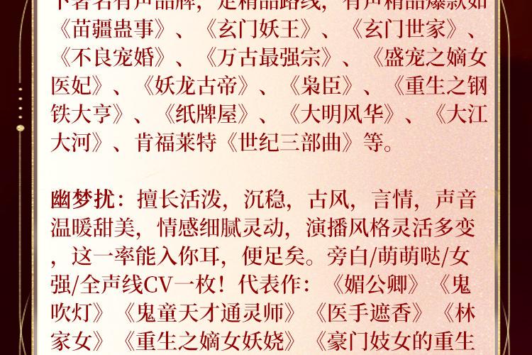 骤雨惊弦:为北京玉水麒麟文化传媒有限公司旗下著名有声品牌,走精品路线,有声精品爆款如《苗疆蛊事》、《玄门妖王》、《玄门世家》、《不良宠婚》、《万古最强宗》、《盛宠之嫡女医妃》、《妖龙古帝》、《枭臣》、《重生之钢铁大亨》、《纸牌屋》、《大明风华》、《大江大河》、肯福莱特《世纪三部曲》等。 幽梦扰:擅长活泼,沉稳,古风,言情,声音温暖甜美,情感细腻灵动,演播风格灵活多变,这一率能入你耳,便足矣。旁白/萌萌哒/女强/全声线CV一枚!代表作:《媚公卿》《鬼吹灯》《鬼童天才通灵师》《医手遮香》《林家女》《重生之嫡女妖娆》《豪门妓女的重生日子》等。 墨风的有声世界:擅长风趣,活泼,成熟,理智风格,用声音圆梦!旁白/男强/公子/全声线CV哦!代表作:《媚公卿》《鬼瞳天才通灵师》《农门婆婆的诰命之路》《薄荷茶蘼梨花白》等。 幽明悦:擅长搞笑,活泼,沉稳,理智风格,新生代主播,言情故事机!旁白/萌萌哒/全声线CV哦!代表作:《侦婚之法医老公住隔壁》《如果你是我的传说》等。