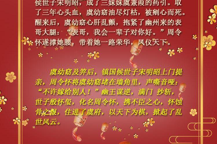 娇软表妹VS腹黑表哥 男女主没有血缘关系! 虞窈做了一个噩梦。梦里,她嫁给镇国侯世子宋明昭,成了三妹妹虞兼葭的药引。取了三年心头血,虞幼窈油尽灯枯,被剜心而死。醒来后,九岁的虞幼窈心肝乱颤,抱紧了幽州来的表哥大腿:“表哥,我会一辈子对你好。”周令怀遂撑她腰,带着她一路荣华,凤仪天下。 虞幼窈十五岁,镇国候世子宋明昭上门提亲,周令怀将虞幼窈堵在墙角里,声嘶音哑:“不许嫁给别人!”幽王谋逆,满门抄斩,世子殷怀玺,化名周令怀,携不臣之心,怀蚀骨之恨,住进了虞府,以天下为棋,掀起了乱世风云。所有人都嘲笑他是个残废,只有小姑娘蹲在他面前,心疼他:“表哥,疼不疼”
