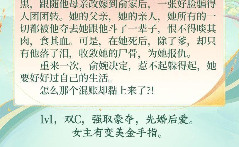 在俞婉的印象里,寇冲狠辣乖戾、阴暗心黑,跟随他母亲改嫁到俞家后,一张好脸骗得人团团转。她的父亲,她的亲人,她所有的一切都被他夺去她跟他斗了一辈子,恨不得啖其肉,食其血。可是,在她死后,除了爹,却只有他落了泪,收敛她的尸骨,为她报仇。 重来一次,俞婉决定,惹不起躲得起,她要好好过自己的生活。怎么那个混账却黏上来了?! 1v1,双C,强取豪夺,先婚后爱。女主有变美金手指。 【作者简介】 青灯:言情小说作者,是个死宅,喜欢简单一点的两个人之间的纯爱故事,文风比较家长里短,朴实无华,三分钟热度,喜欢尝试新题材。 【制作团队】 作者:青灯 出品:阅米文化 画本:余生 对轨:三笑天涯 审听:小乖 后期:大璐璐 演播:瑶琴、二葵、梧枝枝、姚毅摇、研三岁、源和有声、墨忠儒云龙