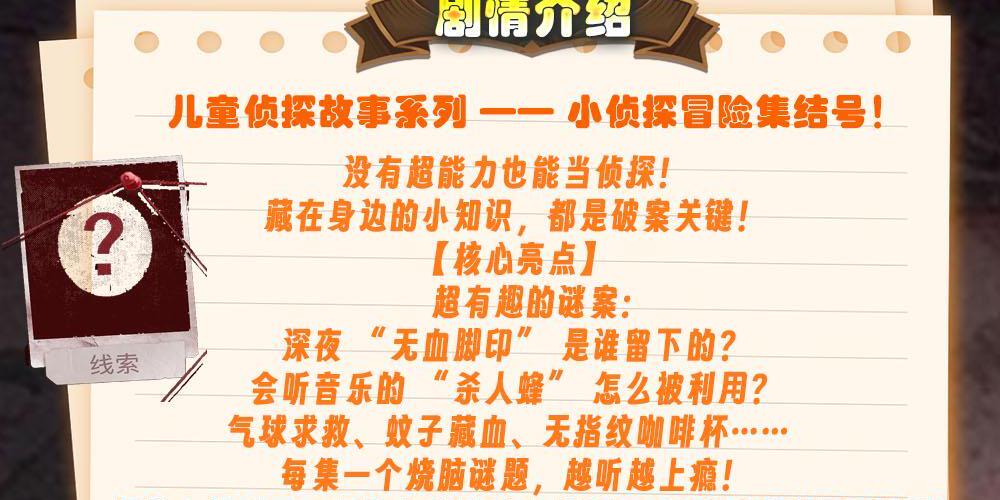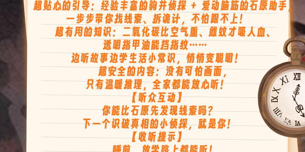 想当小侦探吗?想解锁 “看穿真相” 的超能力吗?快来听《儿童侦探系列故事》! 深夜巷子里的 “无血脚印” 藏着什么秘密?会被音乐影响的 “特殊蜂类” 有什么特别之处?用气球求救的少年怎么传递信号?神秘访客又为何因一只小蚊子露出破绽?每一集都有超烧脑的谜案、超有趣的线索,还有超懂引导的驹井侦探,和总爱 “灵光一闪” 的石原助手! 没有惊悚画面,只有藏在生活里的小知识 —— 二氧化碳比空气重、雌蚊的生活习性、常见物品的特别用途…… 跟着他们一起观察细节、破解谜题,你会发现:原来身边的每一个小现象,都可能是找到答案的关键! 现在就竖起耳朵,和驹井侦探一起,开启一场 “边听故事边学知识” 的侦探冒险吧!下一个识破真相的小侦探,说不定就是你!