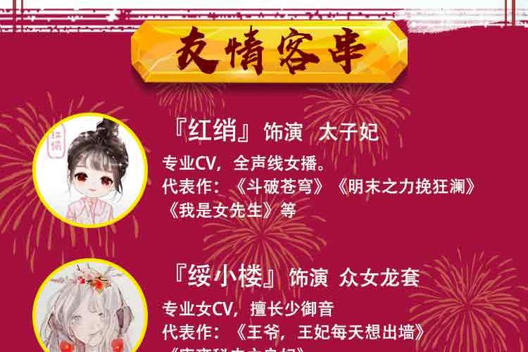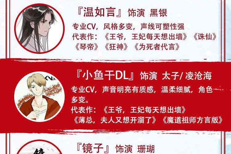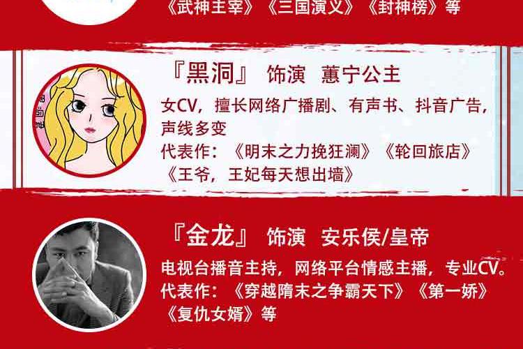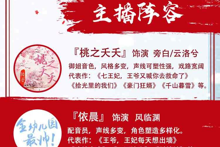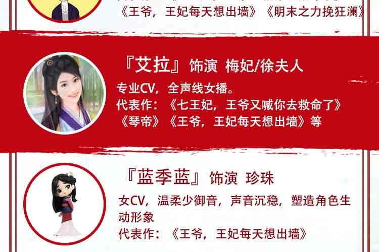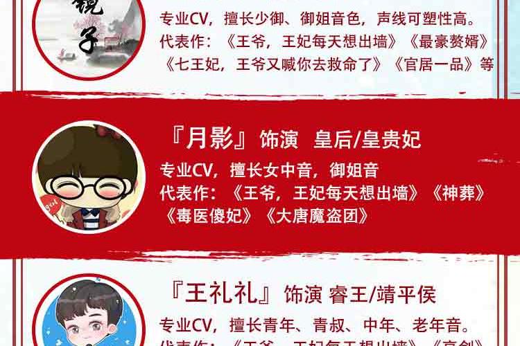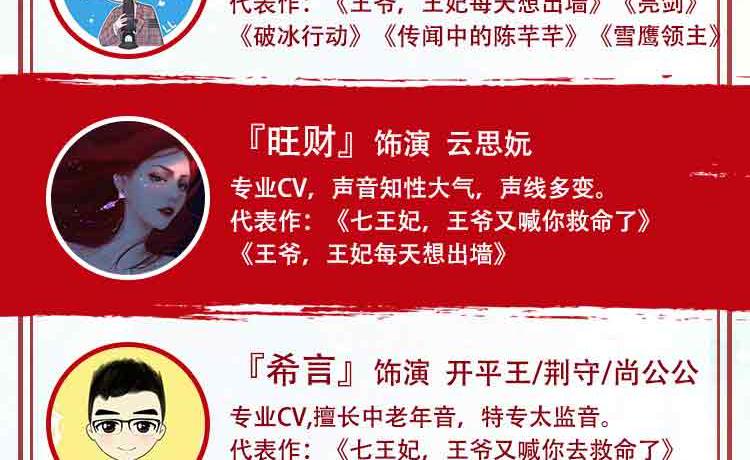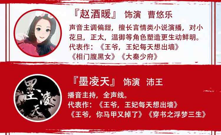 桃之夭夭 御姐音色,风格多变,声线可塑性强,戏路宽阔 代表作:《拾光里的我们》《豪门狂婿》《七王妃,王爷又喊你去救命了》《千山暮雪》等。 依晨 配音员,声线多变,角色塑造多样化。 代表作:《王爷,王妃每天想出墙》《武神主宰》《三国演义》《封神榜》》《恶魔少爷太难缠》 黑洞 女CV,擅长网络广播剧、有声书、抖音广告,声线多变 代表作:《明末之力挽狂澜》、《王爷,王妃每天想出墙》、《轮回旅店》 金龙 电视台从事播音主持10余年担任各大网络平台情感类主播。 有声书代表作:《穿越隋末之争霸天下》《第一娇》《复仇女婿》《女总裁的专职保镖》等 赵酒暖 声音主调偏甜,擅长言情类小说演播,对小花旦,正太,温御等角色塑造更生动鲜明。 代表作:《王爷,王妃每天想出墙》《相门腹黑女》《大秦少府》 墨凌天 播音与主持艺术专业,拥有少年到老年全年龄段声线,不管是萌系、盐系弟弟、还是狼系总裁、伏枥老骥均可驾驭 代表作:《王爷,王妃每天想出墙》《王爷,你马甲又掉了》《穿书之浮梦三生》 温如言 专业CV,风格多变,声线可塑性强 代表作《王爷,王妃每天想出墙》《诛仙》《琴帝》《狂神》《为死者代言》 小鱼干DL 声音明亮有质感,温柔细腻,角色多变。 代表作《王爷,王妃每天想出墙》《薄总,夫人又想开溜了》《魔道祖师方言版》 镜子 专业cv,擅长少御,御姐音色,声线可塑性高。 代表作:《王爷,王妃每天想出墙》《七王妃,王爷又喊你去救命了》《官居一品》《最豪赘婿》 月影 专业CV,擅长女中音,御姐音 代表作:《王爷,王妃每天想出墙》《毒医傻妃》《神葬》《大唐魔盗团》 王礼礼 新晋CV,擅长青年、青叔、中年、老年音。 代表作:《王爷,王妃每天想出墙》《亮剑》《破冰行动》《传闻中的陈芊芊》《雪鹰领主》 旺财 女cv,声音知性大气,声线多变。 代表作:《七王妃,王爷又喊你救命了》《王爷,王妃每天想出墙》 希言 男cv,擅长中老年音,尤其是一些特殊音色 代表作:《七王妃,王爷又喊你去救命了》、《王爷,王妃每天想出墙》《明末之力挽狂澜》 艾拉 全声线女播,声线从正太到御姐到老年音都能驾驭。 代表作:有声小说《农娇有福》《天降鲜妻》《琴帝》《王爷当心,爱妃不好惹》 蓝季蓝 女CV,温柔少御音,声音沉稳,塑造角色生动形象 代表作:《王爷,王妃每天想出墙》 友情客串:红绡、绥小楼