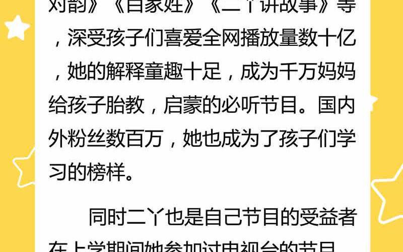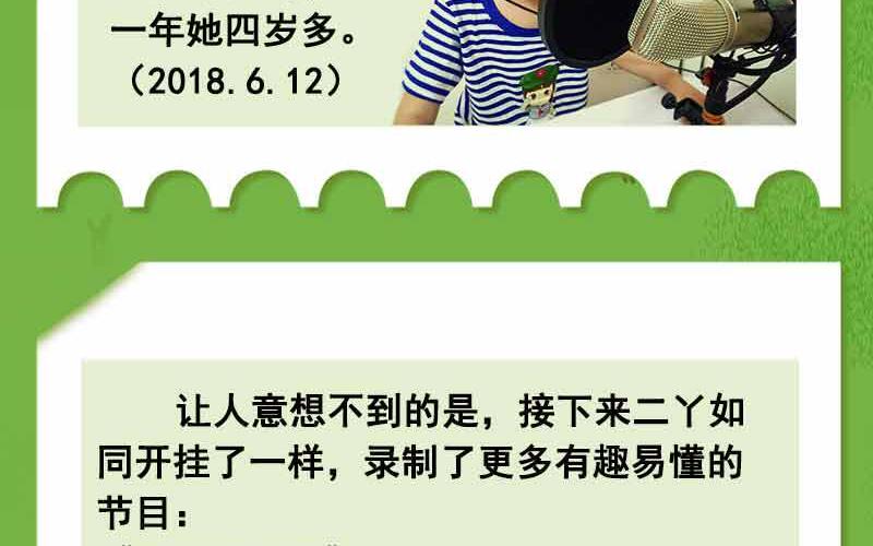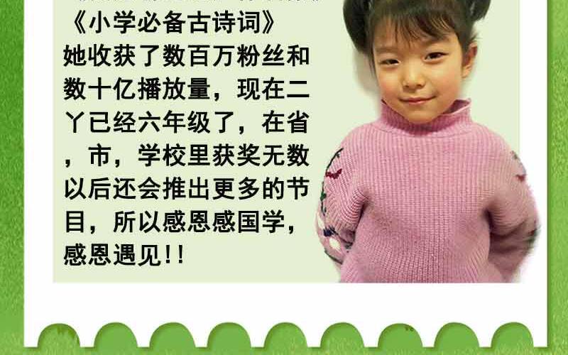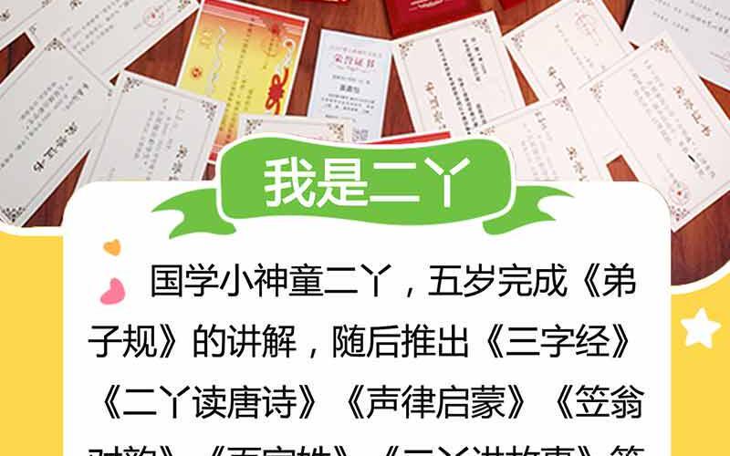 国学小神童,全网播放数十亿。国内外粉丝百万,千万妈妈收藏必听,二丫也是自己节目受益者,获奖无数:全国比赛三等奖,省级比赛一等奖,二等奖,三等奖,市级一等奖,二等奖等。获得中国少年先锋队四星章,市优秀少先队员。 参加过电视台节目,录制的视频登上了CCTV央视网,国学节目被知名教育公司收录。成为了孩子们学习的榜样。她的节目让无数孩子从此爱上了国学。