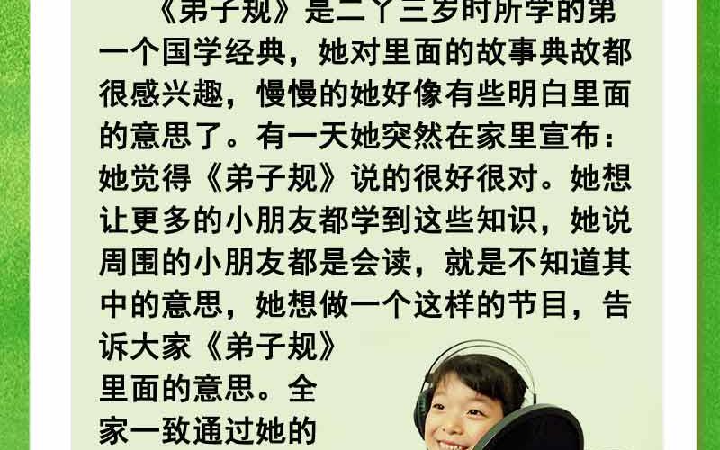 弟子规是每个孩子必学的启蒙情商国学教育经典,在二丫的节目里不但有详细的解释,还加入了领读跟读版,让孩子们读的开心,听得明白。现在还有很多妈妈把二丫的节目作为胎教。从小接受国学启蒙的二丫,希望把所学的道理用到行动中去通过不懈的努力让更多的孩子都能从中受益。二丫现在的节目有《三字经》《弟子规》《唐诗三百首》《声律启蒙》《笠翁对韵》《二丫讲故事》,后续二丫还会推出更多的节目,希望大家喜欢。