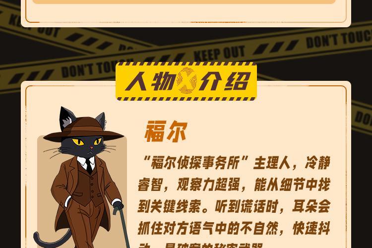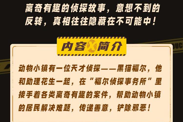 动物小镇有一位天才侦探——黑猫福尔,他和助理花生一起,在“福尔侦探事务所”里接手着各类离奇有趣的案件,帮助动物小镇的居民解决难题,传递善意,铲除邪恶!