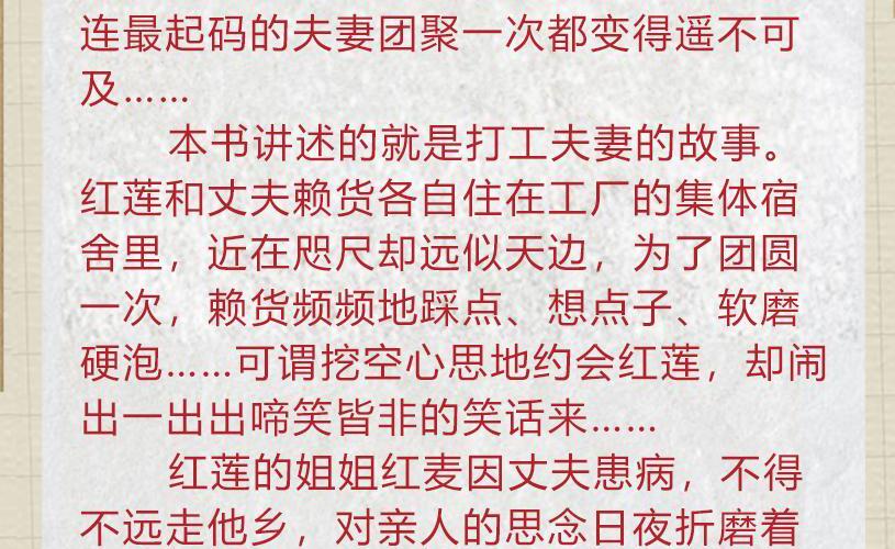 本书讲述的就是打工夫妻的故事。红莲和丈夫赖货各自住在工厂的集体宿舍里,近在咫尺却远似天边,为了团圆一次,赖货频频地踩点、想点子、软磨硬泡……可谓挖空心思地约会红莲,却闹出一出出啼笑皆非的笑话来…… 红莲的姐姐红麦因丈夫患病,不得不远走他乡,对亲人的思念日夜折磨着她。亲情,爱情,甚至最基本的夫妻生活,于他们都是那么的难得…… 那么,他们最终能够摆脱临时夫妻的命运吗?