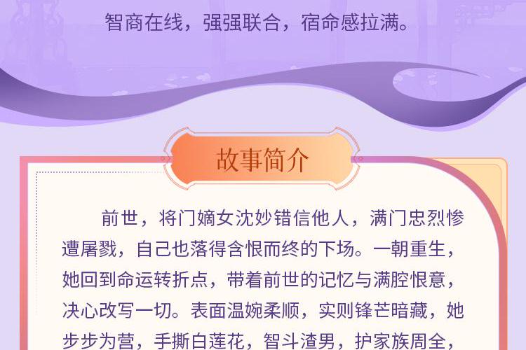 将门嫡女,贞静柔婉,痴恋定王,自奔为眷。 六年辅佐,终成母仪天下。 陪他打江山,兴国土,涉险成为他国人质,五年归来,后宫已无容身之所。 他怀中的美人笑容明艳:“姐姐,江山定了,你也该退了。” 女儿惨死,太子被废。沈家满门忠烈,无一幸免。一朝倾覆,子丧族亡! 沈娇娇怎么也没想到,患难夫妻,相互扶持,不过是一场逢场作戏的笑话! 他道:“看在你跟了朕二十年,赐你全尸,谢恩吧。” 三尺白绫下,沈妙立下毒誓:是日何时丧,予与汝皆亡! 重生回十四岁那年,悲剧未生,亲人还在,她还是那个温柔雅静的将门嫡女。 极品亲戚包藏祸心,堂姐堂妹恶毒无情,新进姨娘虎视眈眈,还有渣男意欲故技重来? 家族要护,大仇要报,江山帝位,也要分一杯羹。这辈子,且看谁斗得过谁! 但是那谢家小侯爷,提枪打马过的桀骜少年,偏立在她墙头傲然:“颠个皇权罢了,记住,天下归你,你——归我!”