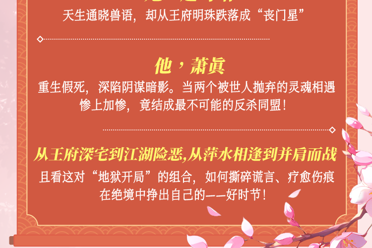 她,赵时晴,天生通晓兽语,却从王府明珠跌落成“丧门星”; 他,萧真,重生假死,深陷阴谋暗影。 当两个被世人抛弃的灵魂相遇,惨上加惨,竟结成最不可能的反杀同盟! 从王府深宅到江湖险恶,从萍水相逢到并肩而战。且看这对“地狱开局”的组合,如何撕碎谎言、疗愈伤痕,在绝境中挣出自己的——好时节!