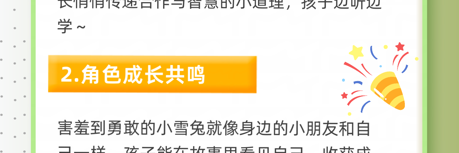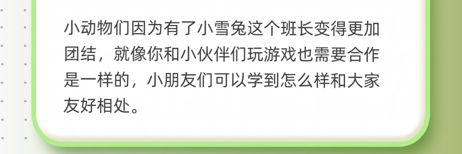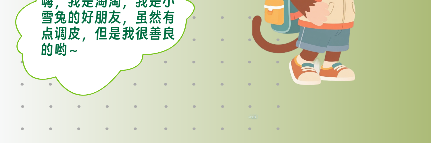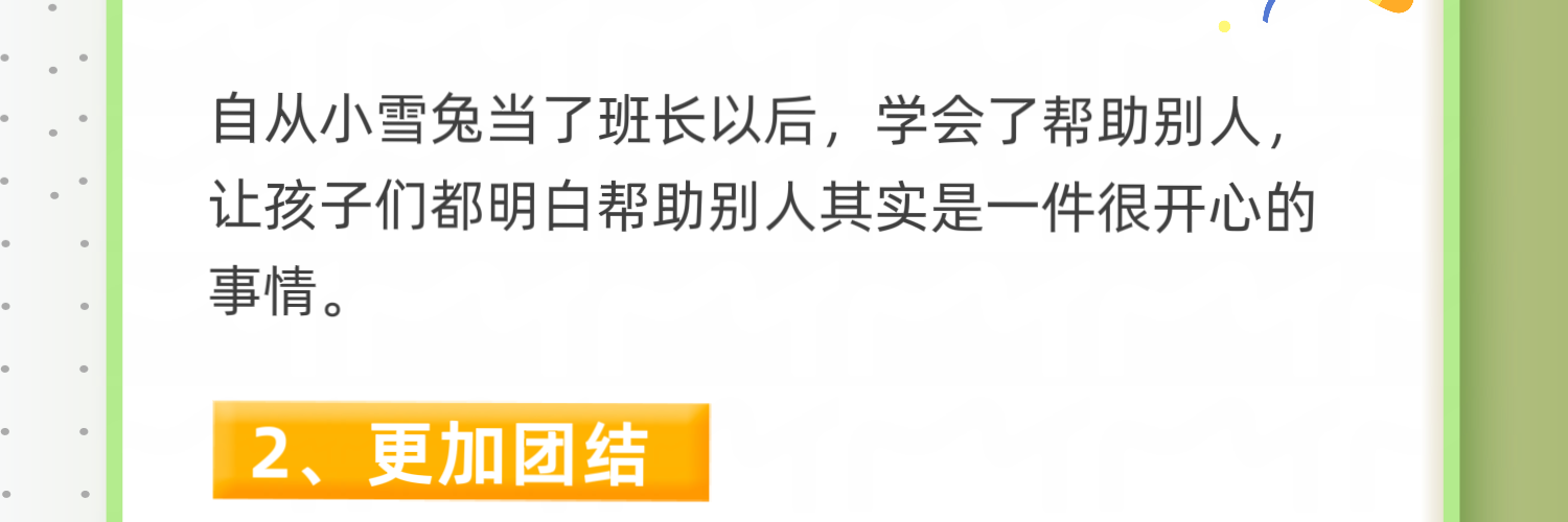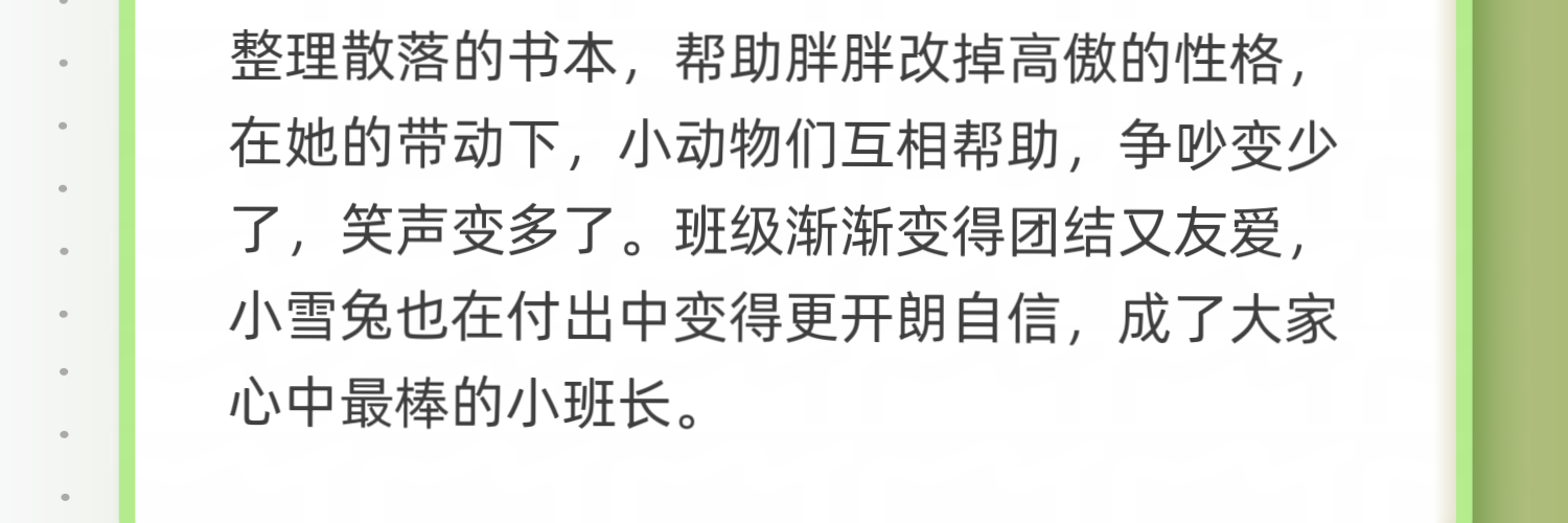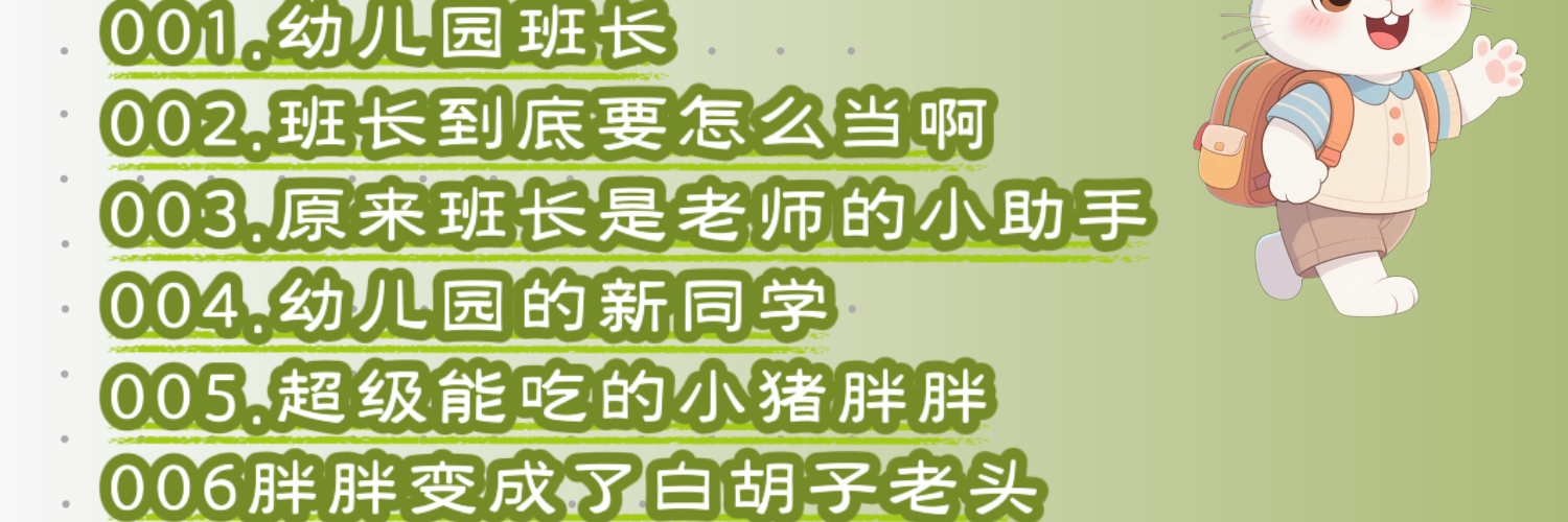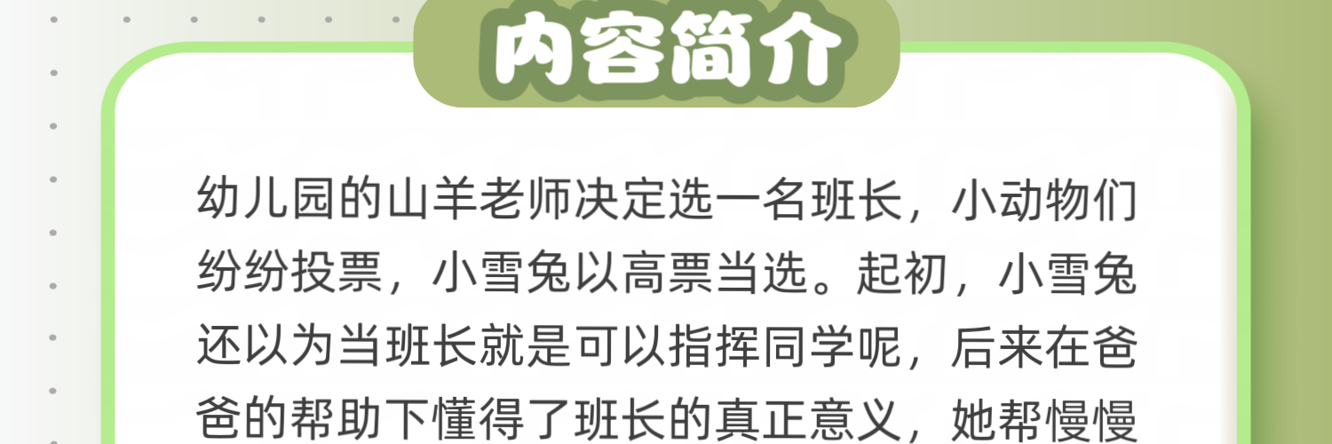 今天对于我们的小雪兔来说,今天可是一个大日子呢。 教室里,山羊老师搬来小黑板,用粉笔写了三个的大字‘选班长’经过小动物们的全票通过,小雪兔顺利的当上了班长,小雪兔当上了班长以后,幼儿园里会发生哪些有趣的故事呢?小朋友们快来听故事吧。