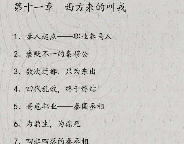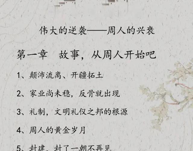 本期专辑从周人在夏朝末期,四处流浪开始讲。周人的先祖,原来一直在陕西渭水流域居住,过着与世无争的生活。后来,随着夏王朝的日趋腐败,他们安居乐业的生活结束了。在夏、商两朝一拨又一拨的强权下,整个周人家族,数次被迫颠沛流离、四海为家。 在流浪的过程中,周人的几十代族人,接力奋斗了七百多年,最终,开创了中国历史上最长的、长达八百余年漫长时光的大周王朝。在王朝的盛世阶段,周人还将我们炎黄子孙引以为荣的华夏文明,由孱弱逐步推向了强盛。可是,世间万物的进行,冥冥之中所遵循的法则,大多是“物极必反”和“祸福相依”。周王朝盛世之后的接任者,一任不如一任。他们集体在同甘共苦、同床异梦,相爱相残、自我为难的这条不归路上,一路狂奔,最终走向了沉沦。而此刻围绕在华夏大地四方的戎人、狄人、蛮人、夷人,也适时地由不矜不伐的四方朝贡者,集体变成了面目狰狞的来犯者。于是,血流漂杵的混战,在八百年的时间里,不分亲疏远近,昼夜演绎。在周王朝早期,位于王朝西方的秦人,以默默无闻的养马人为起点,埋头苦干,奋发图强。后倾其所有,救风雨飘摇的周王室于危难之中,终于换来了一张约等于“本科”学历的爵位证书和一张画在地图上的大饼。