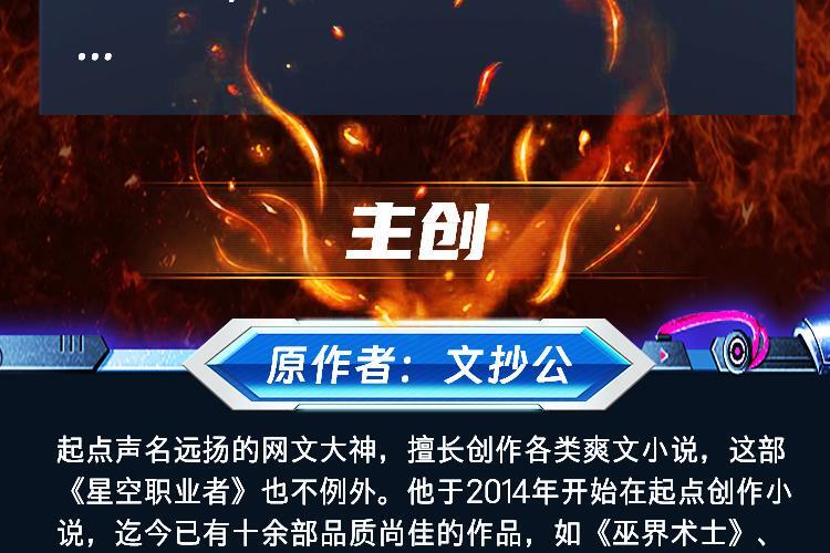主创:原作者:文抄公 起点声名远扬的网文大神,擅长创作各类爽文小说,这部《星空职业者》也不例外。他于2014年开始在起点创作小说,迄今已有十余部品质尚佳的作品,如《巫界术士》、《逍遥梦路》、《神秀之主》和《神秘之劫》等
