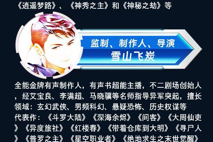 监制、制作人、导演:雪山飞炭全能金牌有声制作人,有声书超能主播,不二剧场创始人,经艾宝良、李满超、马晓骥等名师指导异军突起,擅长领域:玄幻武侠、男频科幻、悬疑恐怖、历史权谋等