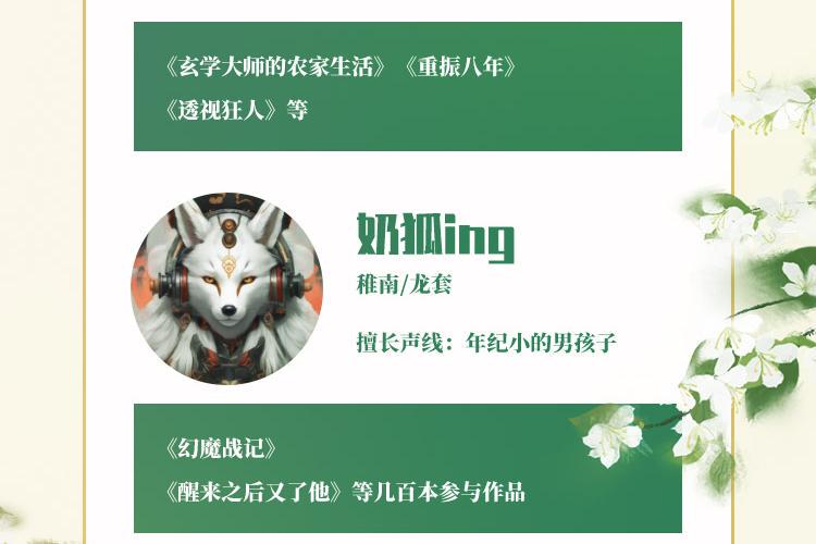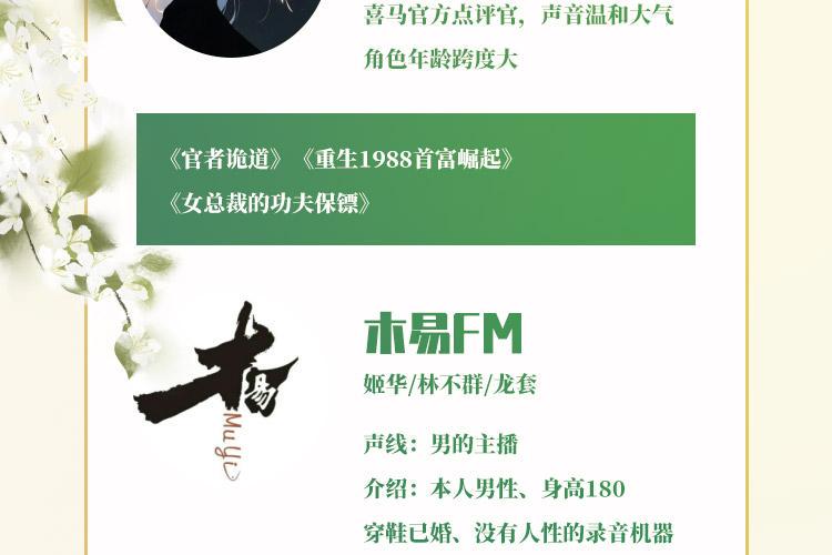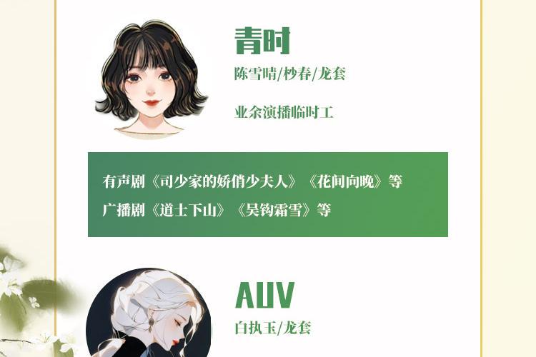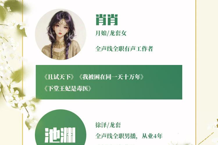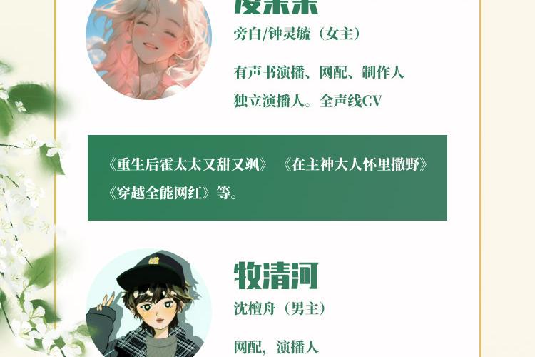 Cv凌茉茉-旁白/钟灵毓(女主):有声书演播、网配、制作人、独立演播人。全声线cv 代表作 《重生后霍太太又甜又飒》 《在主神大人怀里撒野》《穿越全能网红》等。 Cv肖肖 :全声线全职有声工作者 代表作:《且试天下》 《我被困在同一天十万年》 《下堂王妃是毒医》 cv一眠-孟初寒/姬吕/龙套:全声线温柔欢脱男播,代表作《龙争虎斗》、《这样修仙合理吗》。