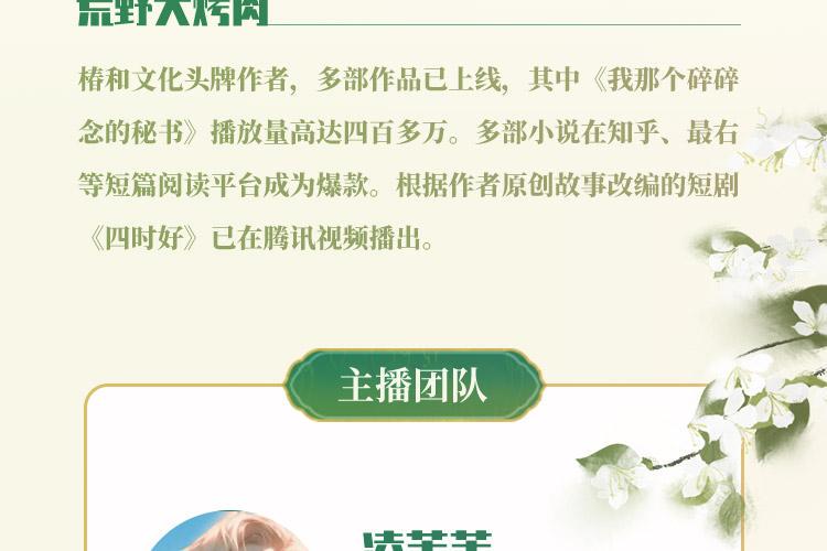 荒野大烤肉,椿和文化签约作家,多部小说改编的广播剧已在漫播APP上线,其中短篇小说《女皇的作精男皇后》改编的短剧《四时好》已在腾讯视频播出,小说作品《我在锦主卫混日子》改编的短剧正在开发中。