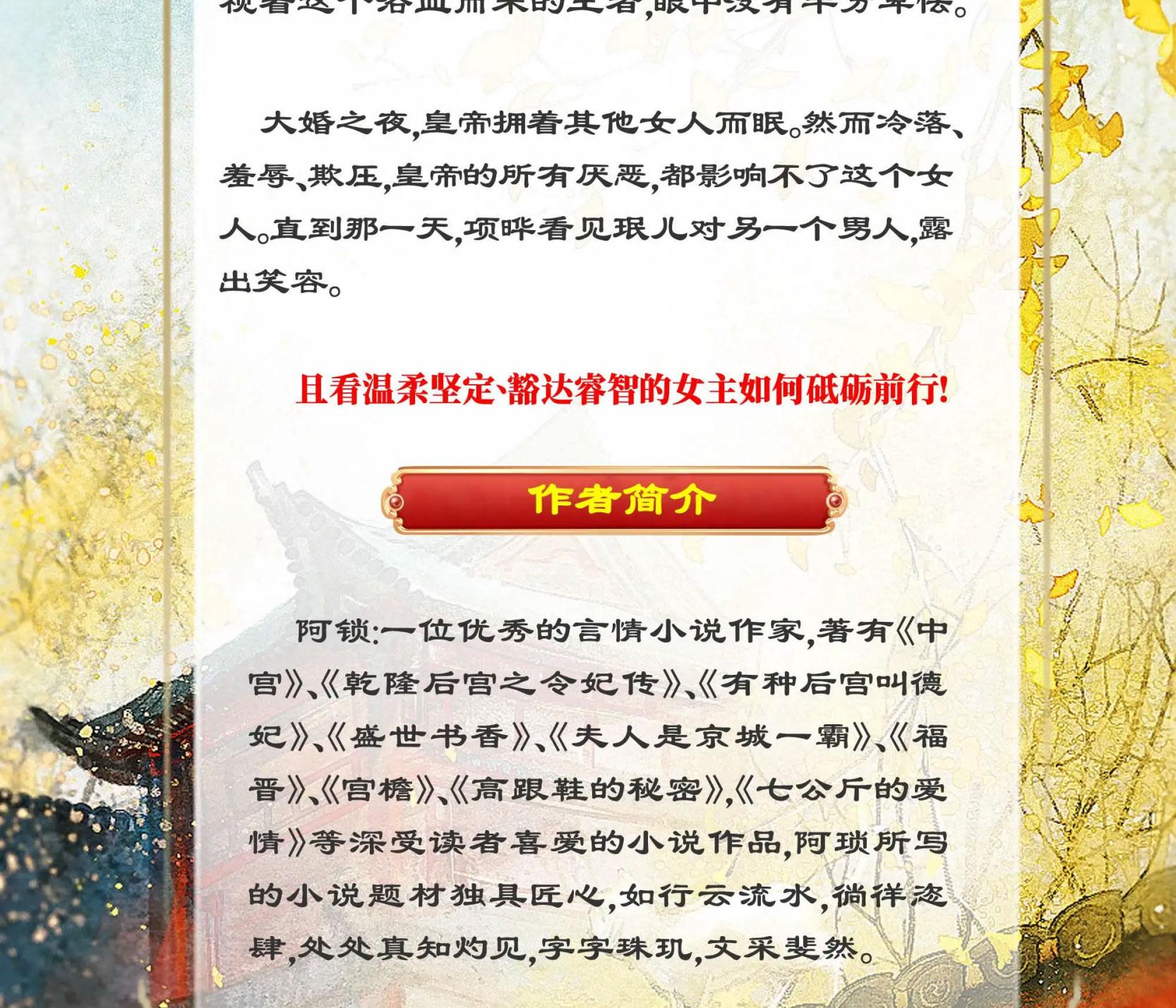 阿琐,知名言情作家,主要作品《有种后宫叫德妃》《乾隆后宫之令妃传》《中宫》《宫檐》《盛世书香》《高跟鞋的秘密》《黑店小娘子》《金枝玉叶》等畅销小说。