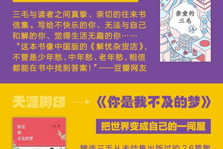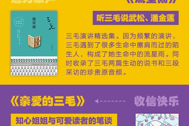 一袭波西米亚长裙,征服遥远的撒哈拉 奇女子三毛以她的勇敢、洒脱、热忱, 成为了无数人对自由与远方的最初想象。 在留学与旅行都已不再新鲜的今天, 三毛笔下那个“穷穷的但快快乐乐的”浪漫世界, 似乎也如海市蜃楼般触不可及。 但正因为增长了年纪和阅历, 倾听那一篇篇来自天涯海角的文字,浸润岁月醇香的心声 我们才有幸遇见一个更立体、鲜活的三毛。 她正眯着盈盈笑眼,回应我们的烦恼,继续与我们对话——