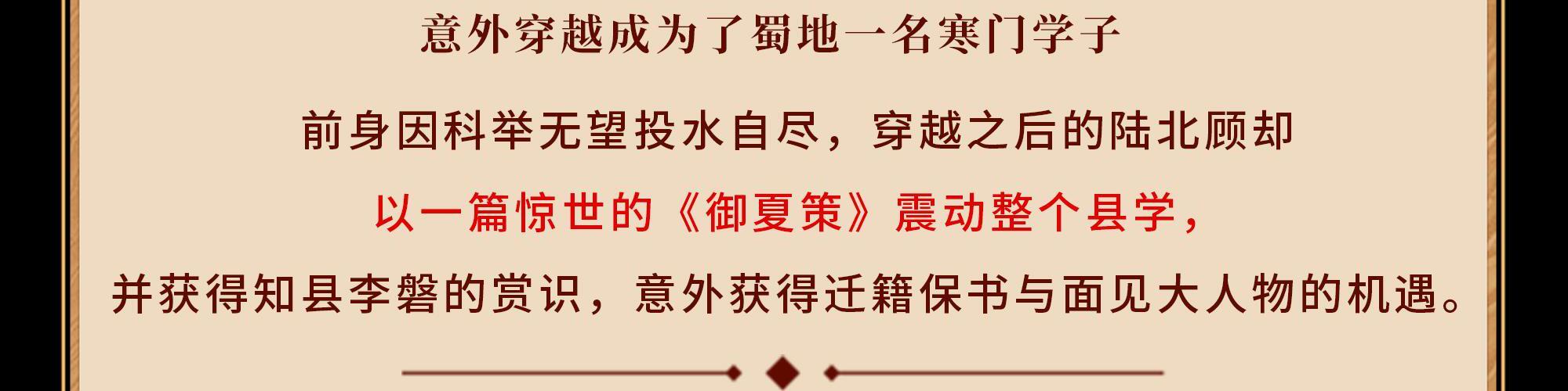 北宋嘉祐元年,现代文科学霸陆北顾,意外穿越成为了蜀地一名寒门学子。前身因科举无望投水自尽,穿越之后的陆北顾却以一篇惊世的《御夏策》震动整个县学,并获得知县李磐的赏识,意外获得迁籍保书与面见大人物的机遇。
