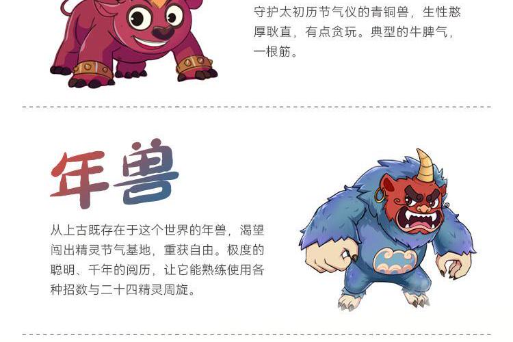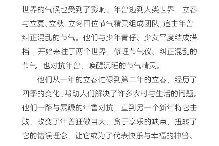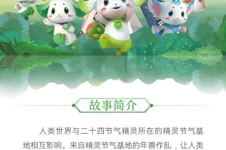 人类世界与二十四节气精灵所在的精灵节气基地相互影响。来自精灵节气基地的年兽作乱,让人类世界的气候也受到了影响。年兽逃到人类世界,立春与立夏立秋立冬四位节气精灵组成团队追击年兽纠正混乱的节气。他们与少年青仔、少女平度结成搭档,开始来往于两个世界,修理节气仪、纠正混乱的节气,也对抗年兽,唤醒沉睡的节气精灵他们从一年的立春忙碌到第二年的立春,经历了四季的变化帮助人们解决了许多农时与生活的问题他们一路与暴躁的年鲁对抗,直到另一个新年将它击败,改变了年兽狂傲自大、贪于享乐的缺点,扭转了它的错误理念,让它或为了代表快乐与幸福的神兽
