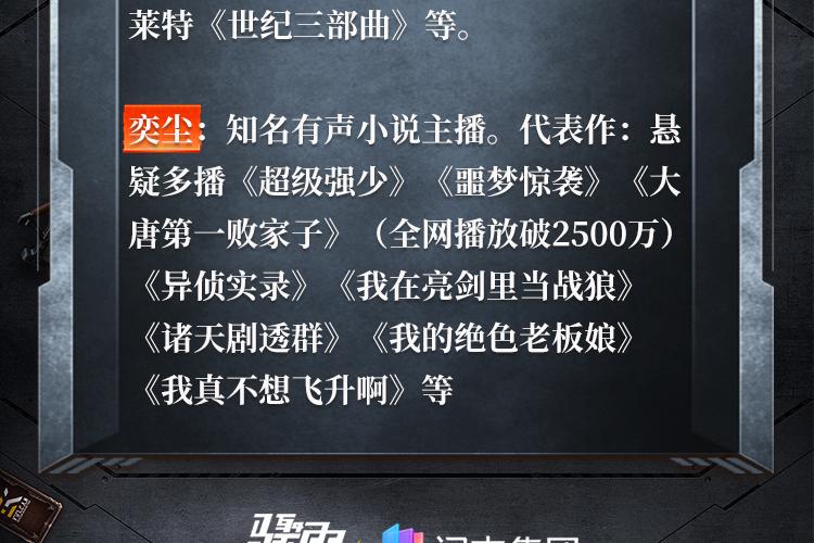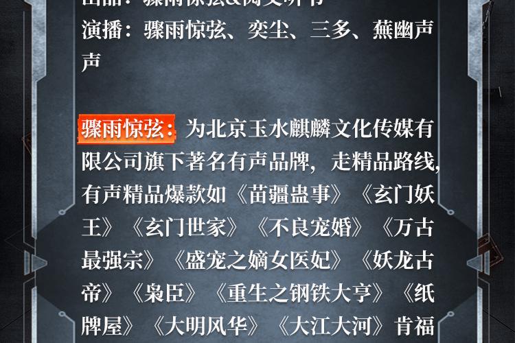 骤雨惊弦:为北京玉水麒麟文化传媒有限公司旗下著名有声品牌,走精品路线,有声精品爆款如《苗疆蛊事》、《玄门妖王》、《玄门世家》、《不良宠婚》、《万古最强宗》、《盛宠之嫡女医妃》、《妖龙古帝》、《枭臣》、《重生之钢铁大亨》、《纸牌屋》、《大明风华》、《大江大河》、肯福莱特《世纪三部曲》等。 奕尘:知名有声小说主播。代表作:悬疑多播《超级强少》、《噩梦惊袭》、《大唐第一败家子》(全网播放破2500万)、《异侦实录》、《我在亮剑里当战狼》《诸天剧透群》、《我的绝色老板娘》、《我真不想飞升啊》等