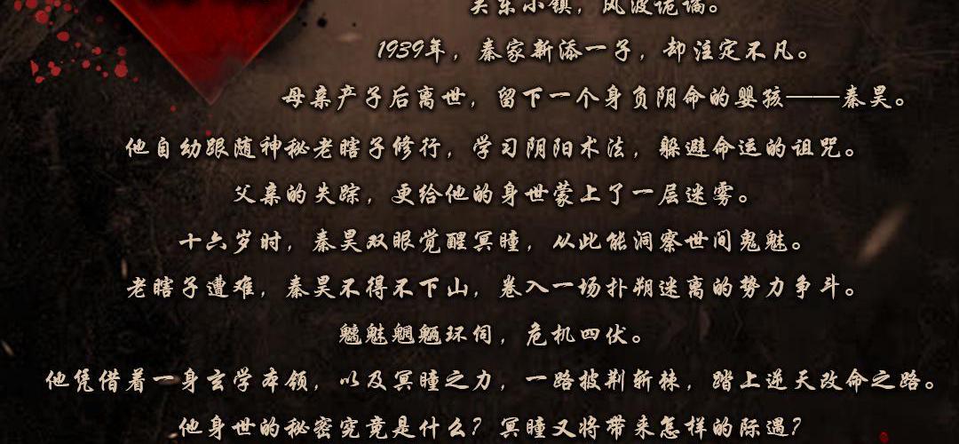 关东小镇,风波诡谲。1939年,秦家新添一子,却注定不凡。母亲产子后离世,留下一个身负阴命的婴孩——秦昊。 他自幼跟随神秘老瞎子修行,学习阴阳术法,躲避命运的诅咒。父亲的失踪,更给他的身世蒙上了一层迷雾。十六岁时,秦昊双眼觉醒冥瞳,从此能洞察世间鬼魅。 老瞎子遭难,秦昊不得不下山,卷入一场扑朔迷离的势力争斗。魑魅魍魉环伺,危机四伏。他凭借着一身玄学本领,以及冥瞳之力,一路披荆斩棘,踏上逆天改命之路。 他身世的秘密究竟是什么?冥瞳又将带来怎样的际遇?昔日朋友、师长,又将何去何从?且看秦昊,如何逆风破局,搅动风云!