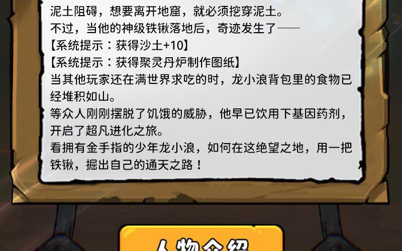 一开局,龙小浪就出现在了阴暗的地窟里,四处被密封的泥土阻碍,想要离开地窟,就必须挖穿泥土。不过,当他的神级铁锹落地后,奇迹发生了—— 【系统提示:获得沙土+10】 【系统提示:获得聚灵丹炉制作图纸】 当其他玩家还在满世界求吃的时,龙小浪背包里的食物已经堆积如山。 等众人刚刚摆脱了饥饿的威胁,他早已饮用下基因药剂,开启了超凡进化之旅。 看拥有金手指的少年龙小浪,如何在这绝望之地,用一把铁锹,掘出自己的通天之路!