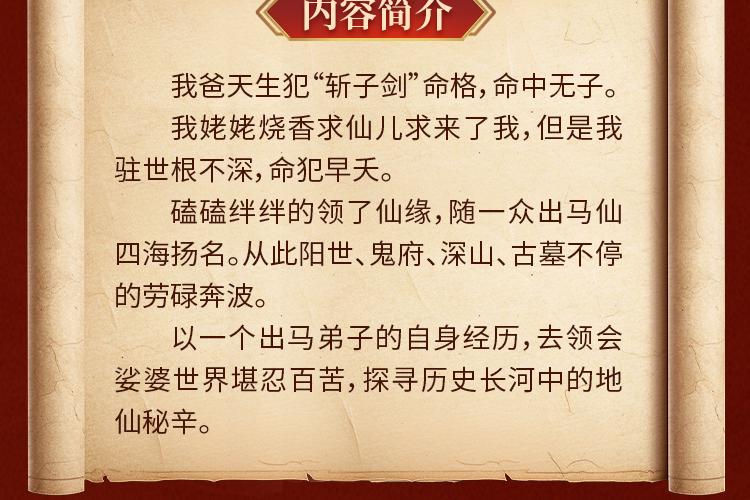 我爸天生犯“斩子剑”命格,命中无子。 我姥姥烧香求仙儿求来了我,但是我驻世根不深,命犯早夭。 磕磕绊绊的领了仙缘,随一众出马仙四海扬名。从此阳世、鬼府、深山、古墓不停的劳碌奔波。 以一个出马弟子的自身经历,去领会娑婆世界堪忍百苦,探寻历史长河中的地仙秘辛。