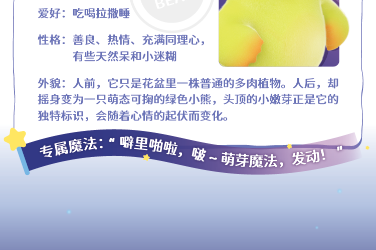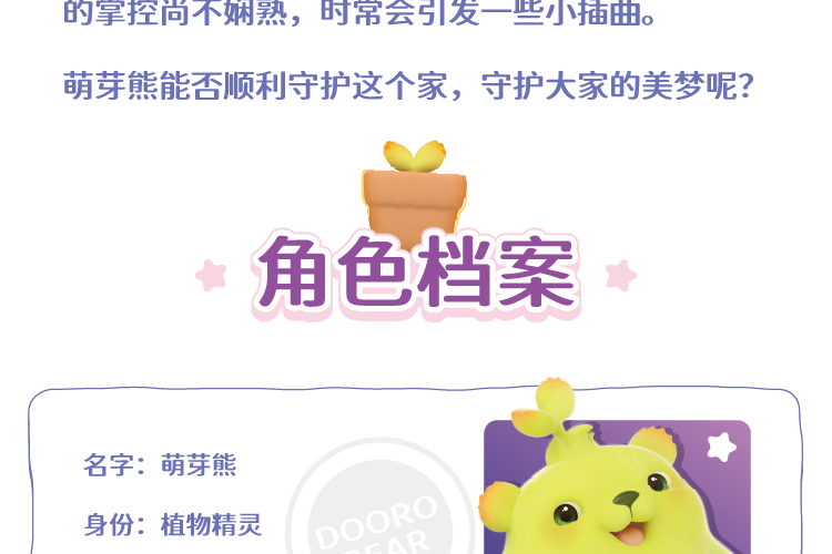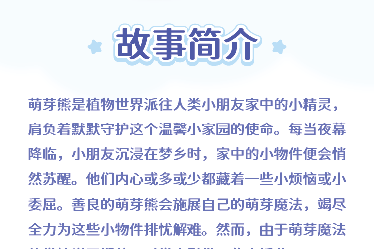 萌芽熊是植物世界派往人类小朋友家中的小精灵,肩负着默默守护这个温馨小家园的使命。每当夜幕降临,小朋友沉浸在梦乡时,家中的小物件便会悄然苏醒。它们内心或多或少都藏着一些小烦恼或小委屈。善良的萌芽熊会施展自己的萌芽魔法,竭尽全力为这些小物件排忧解难。然而,由于对萌芽魔法的掌控尚不娴熟,时常会引发一些小插曲。 萌芽熊能否顺利守护这个家,守护大家的美梦呢?