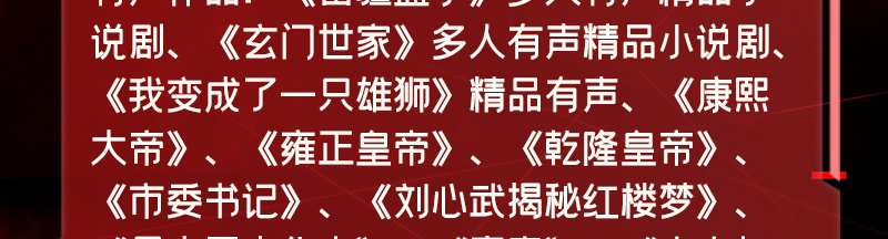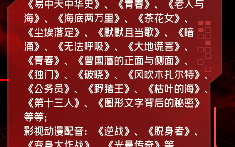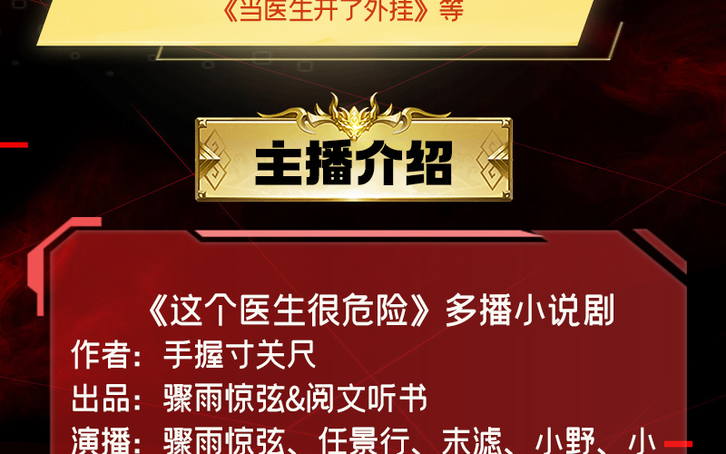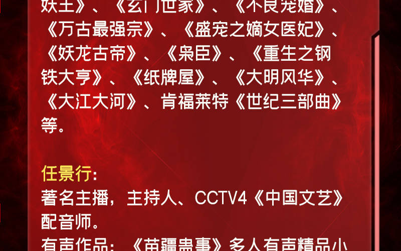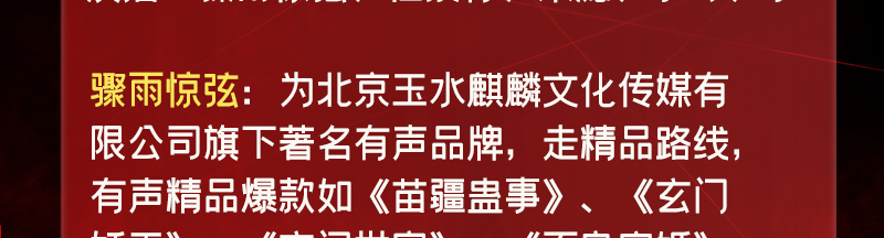骤雨惊弦:为北京玉水麒麟文化传媒有限公司旗下著名有声品牌,走精品路线,有声精品爆款如《苗疆蛊事》、《玄门妖王》、《玄门世家》、《不良宠婚》、《万古最强宗》、《盛宠之嫡女医妃》、《妖龙古帝》、《枭臣》、《重生之钢铁大亨》、《纸牌屋》、《大明风华》、《大江大河》、肯福莱特《世纪三部曲》等。 任景行: 著名主播,主持人、CCTV4《中国文艺》配音师。 有声作品:《苗疆蛊事》多人有声精品小说剧、《玄门世家》多人有声精品小说剧、《我变成了一只雄狮》精品有声、《康熙大帝》、《雍正皇帝》、《乾隆皇帝》、《市委书记》、《刘心武揭秘红楼梦》、《易中天中华史》、《青春》、《老人与海》、《海底两万里》、《茶花女》、《尘埃落定》、《默默且当歌》、《暗涌》、《无法呼吸》、《大地谎言》、《青春》、《曾国藩的正面与侧面》、《独门》、《破晓》、《风吹木扎尔特》、《公务员》、《野猪王》、《枯叶的海》、《第十三人》、《图形文字背后的秘密》等等; 影视动漫配音:《逆战》、《脱身者》、《变身大作战》、《光晕传奇》等。