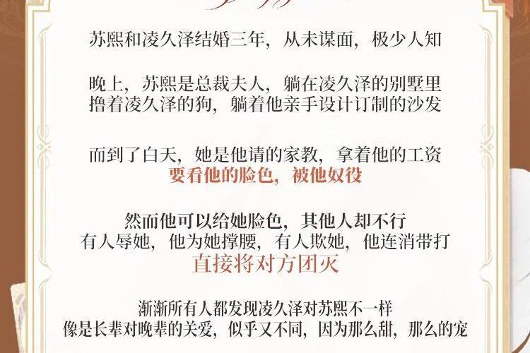苏熙和凌久泽结婚三年,从未谋面,极少人知。 晚上,苏熙是总裁夫人,躺在凌久泽的别墅里,撸着凌久泽的狗,躺着他亲手设计订制的沙发。而到了白天,她是他请的家教,拿着他的工资,要看他他奴役。 然而他可以给她脸色,其他人却不行,有人辱她,他为她撑腰,有人欺她,他连消带打,直接将对方团灭。 渐渐所有人都发现凌久泽对苏熙不一样,像是长辈对晚辈的关爱,似乎又不同,因为那么甜,那么的宠,他本是已经上岸的恶霸,为了她又再次杀伐果断,狠辣无情!也有人发现了苏熙的不同,比如本来家境普通的她竟然戴了价值几千万的奢侈珠宝,有人柠檬,“她金主爸爸有钱呗!”苏熙不屑回眸,“不好意思,这是老娘自己创的品牌!”