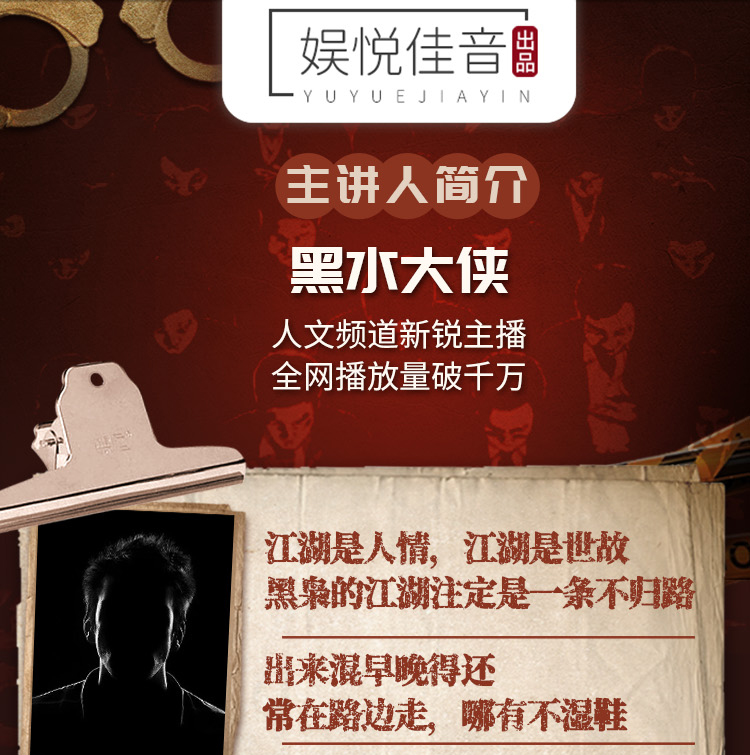 黑水大侠 人文频道新锐主播 全网播放量破千万 一个爱看小说和听小说的小伙,为大家带来一样的故事不一样的传讲角度。