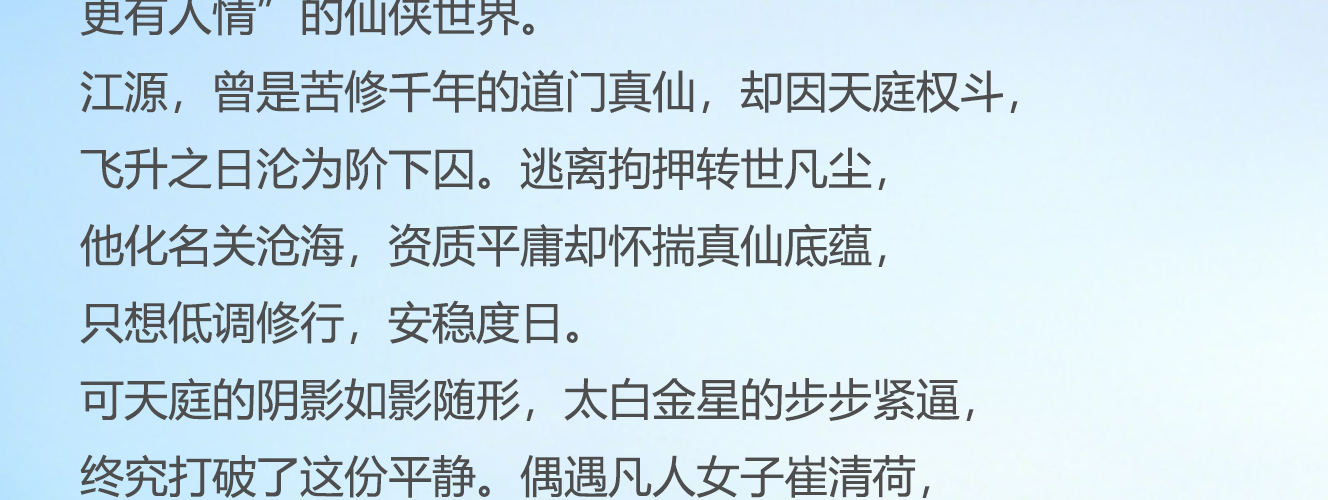 核心看点 凡人流 + 真仙底蕴:主角以凡人之躯,凭前世真仙的知识与经验,在低阶修士中脱颖而出,反差感强烈。 天庭权谋与仙侠江湖:既有天庭的权力斗争,也有凡间宗门的恩怨情仇,展现了宏大的仙侠世界。 慢热修行与日常经营:小说注重修行细节与市井生活,江源与清荷的夫妻互动、仙市经营等情节,增添了故事的烟火气。