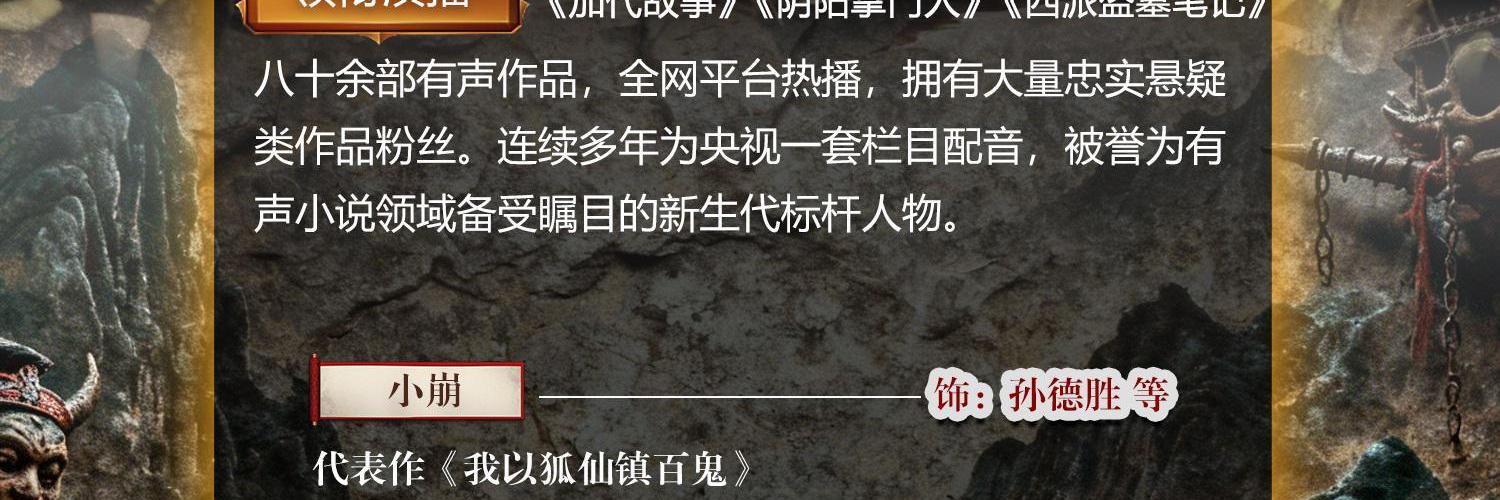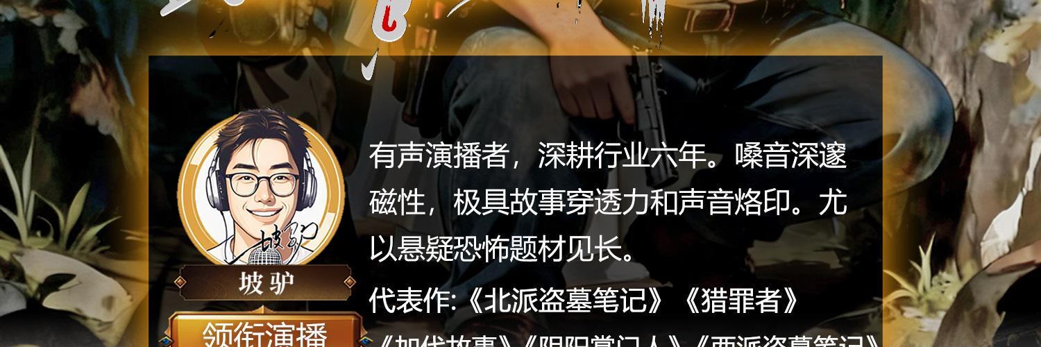 有声界的一名小学生,主述作品70多部,代表作《猎罪者》《民调局异闻录》《北派盗墓笔记》《阴阳掌门人》