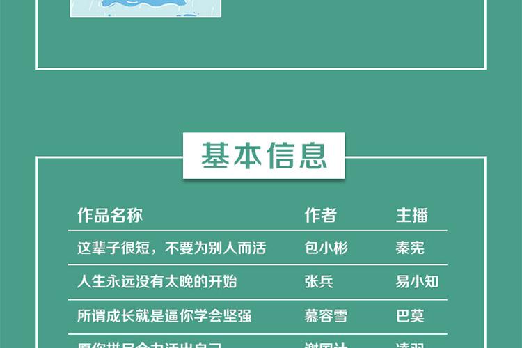 易小知:普通话一级乙等,擅长新闻播音、节目主持、舞台朗诵、纪录片配音、广播剧策划、电台主播,曾担任三年少儿口才培训讲师。 秦宪,著名节目主持人,国家一级播音员,专注播音十二年。新闻播音、综艺主持、舞台朗诵、纪录片配音、广播剧创作、话剧表演、电台主播。 巴莫:西安广播电视台栏目主持人。新闻播音、综艺主持、舞台朗诵、纪录片配音、广播剧创作、话剧表演、电台主播。代表作品有《你的自律给你自由》《所谓成长,就是逼你学会坚强》等多部作品。 凌羽:电台主播,省级播音主持一等奖,在播音主持行业工作十年,擅长广告、纪录片配音。