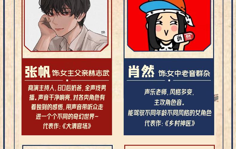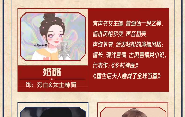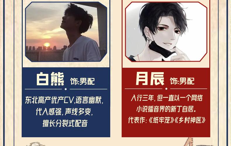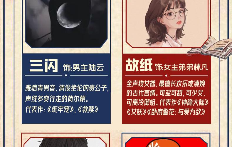 奶酪:播讲风格多变,声音甜美。代表作《乡村神医》《重生后夫人她成了全球首富》 三闪:雅痞青男音,清俊绝伦的贵公子,声线多变,行走的荷尔蒙。代表作《纸牢笼》