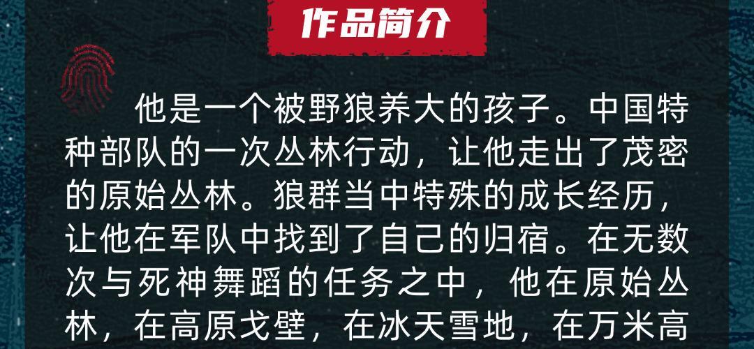 他是一个被野狼养大的孩子。中国特种部队的一次丛林行动,让他走出了茂密的原始丛林。 狼群当中特殊的成长经历,让他在军队中找到了自己的归宿。在无数次与死神舞蹈的任务之中,他在原始丛林,在高原戈壁,在冰天雪地,在万米高空,在无渊深海,他用热血诠释无悔的军魂...