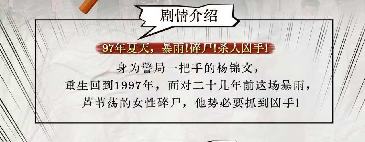 97年夏天,暴雨!碎尸!杀人凶手! 杨锦文重生回到1997年,面对二十几年前这场暴雨,芦苇荡的女性碎尸,他势必要抓到凶手!