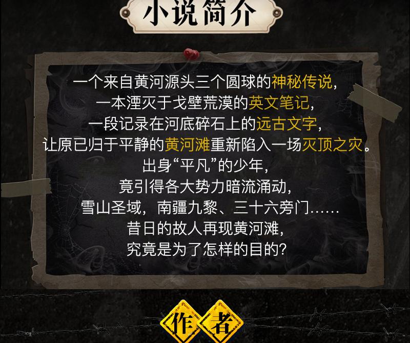 一个来自黄河源头三个圆球的神秘传说,一本湮灭于戈壁荒漠的英文笔记,一段记录在河底碎石上的远古文字,让原已归于平静的黄河滩重新陷入一场灭顶之灾。 出身“平凡”的少年,竟引得各大势力暗流涌动,雪山圣域,南疆九黎、三十六旁门……昔日的故人再现黄河滩,究竟是为了怎样的目的? 延续了几代人的恩怨,真的能终结吗?