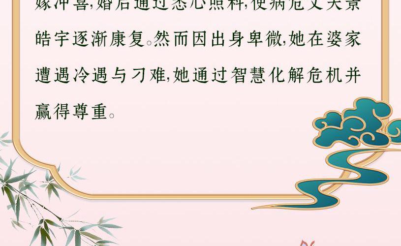 庶女莫芸溪被家族安排,代替嫡姐出嫁冲喜,婚后通过悉心照料,使病危丈夫景皓宇逐渐康复。然而因出身卑微,她在婆家遭遇冷遇与刁难,她通过智慧化解危机并赢得尊重。