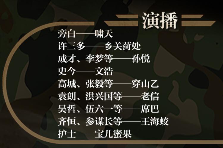啸天:华音独家旁白,主任播音员,代表作《风雨送春归》《足球是宝》《敌后武工队》《小王子》《血色天都》《浮生六记》,莫言《酒国》村上春树《神的孩子全跳舞》等数十部有声作品。 文浩:华音传媒独家签约主播,小说剧导演。声音独特、亲和力十足,极具演播天赋。代表作:《我的团长我的团》《北平无战事》《亮剑》《血色浪漫》《租鬼公司》《生死线》《士兵突击》《莫言系列之四十一炮》《重案六组》《破冰行动》《深渊逆刃》等。 孙悦:90后新生代配音演员,声线以宽厚青叔音见长,多有怪兽、搞怪玩性特点。参配电影:《敦刻尔克》、《维京·王者之战》、《狂暴巨兽》、《新乌龙院》等。 乡关荷处:一级播音员,代表作《士兵突击》,《我的团长我的团》,《苔藓》等。